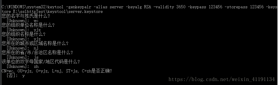 keytool -genkeypair -alias server -keyalg RSA -validity 3650 -keypass 123456 -storepass 123456 -keystore E:\sslhttpTest\keystool\server.keystore