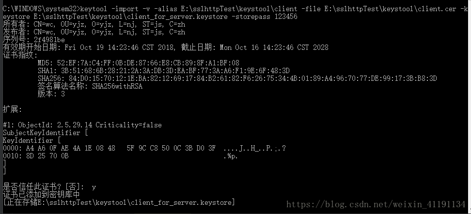 keytool -import -v -alias E:\sslhttpTest\keystool\client -file E:\sslhttpTest\keystool\client.cer -keystore E:\sslhttpTest\keystool\client_for_server.keystore -storepass 123456