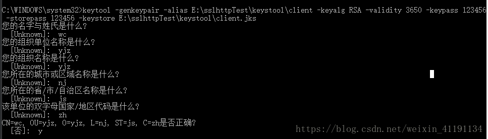 keytool -genkeypair -alias E:\sslhttpTest\keystool\client -keyalg RSA -validity 3650 -keypass 123456 -storepass 123456 -keystore E:\sslhttpTest\keystool\client.jks