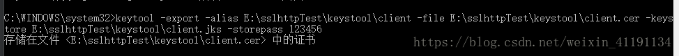 keytool -export -alias E:\sslhttpTest\keystool\client -file E:\sslhttpTest\keystool\client.cer -keystore E:\sslhttpTest\keystool\client.jks -storepass 123456
