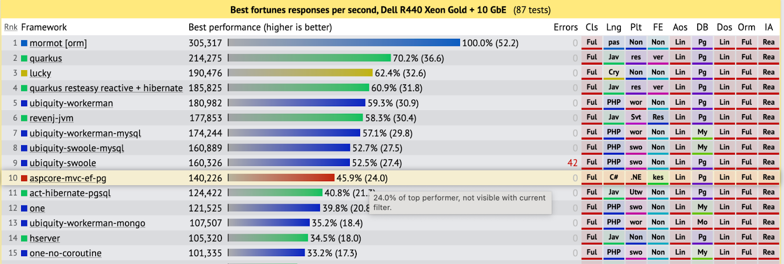 性能很少是选择语言的主因,但无疑是锦上添花。从这个角度看,C# 表现优异。观察最具代表性的 TechEmpower 基准测试 "fortunes"(使用 ORM 和完整框架),主流的 .NET 技术栈位列第 10(共 80 个)。可以公平地说,排名再靠前的框架多数较为小众,并非你会随意采用的技术。