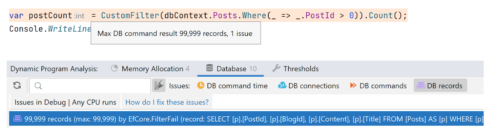 成熟生态系统带来的丰富高质量工具是另一大优势。我们使用 Rider -- 这是一款出色的 IDE,非商业用途免费 - 我强烈推荐它。它具备所有预期功能(调试、测试、重构等),还支持动态程序分析等高级特性,能自动检测低效数据库访问模式、过度内存分配、缓慢 HTTP 处理程序等问题。交互式调试无缝且强大,内存分析、快照对比、堆检查、泄漏检测等功能一应俱全。