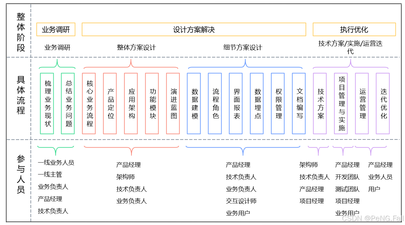 06 B端产品总体建设流程(1) B端产品的整体建设采用自顶向下的设计思路,从抽象到具体逐步进行。下图为B端产品总体建设流程:B端产品总体建设流程图注:有时「技术方案」可能在架构师参与整体方案设计或细节方案设计时就已经开始进行技术选型和系统底层架构搭建了。后面在产品「执行优化」阶段不断迭代过程中也会存在技术方案的设计以及产品细节的调整和优化。