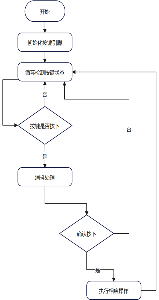 按键模块的主要功能是检测按键是否被按下,若按下则产生相应的事件。其程序流程为:初始化按键引脚,循环检测按键状态,若检测到按键按下,进行消抖处理,确认按下后执行相应操作。