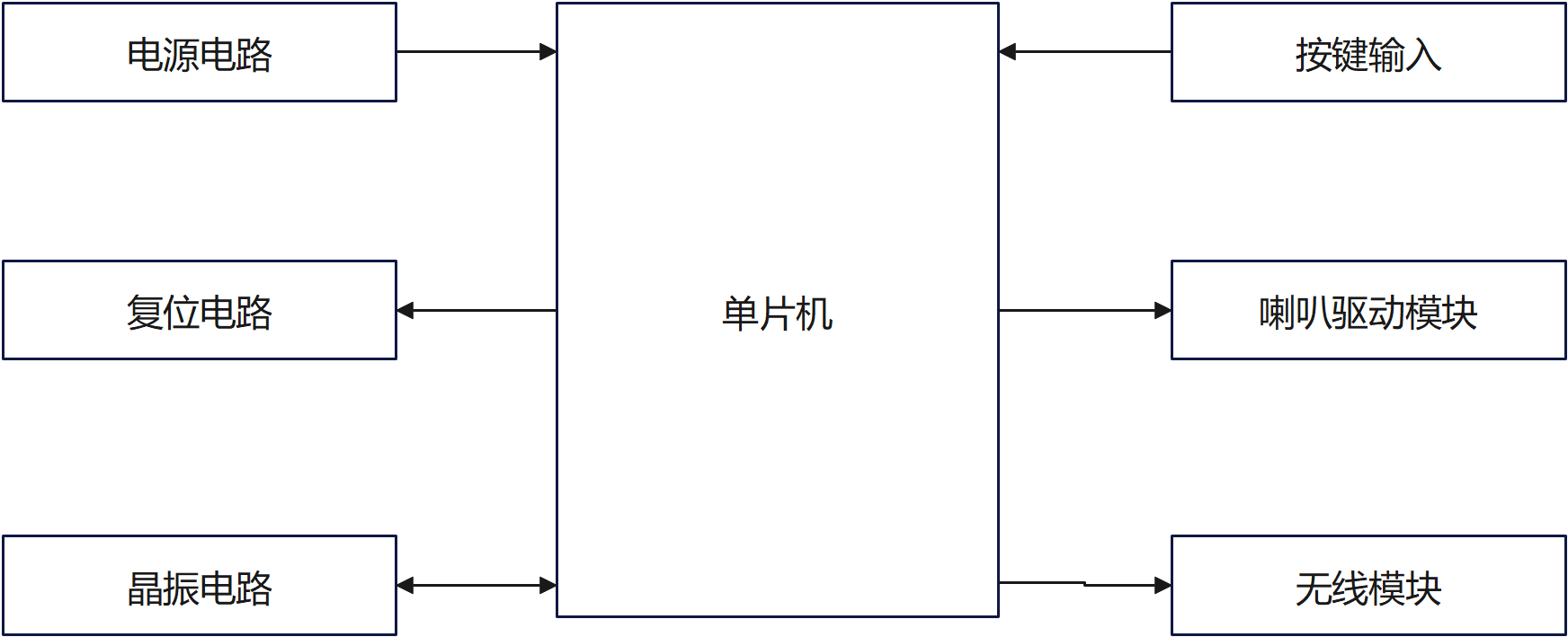 基于单片机的音乐电子门铃设计需要单片机、电源电路、复位电路、晶振电路、按键输入、喇叭驱动模块、无线模块来实现所需要的功能[6]。根据上述选择绘制出设计的系统框架图如图2.1所示。