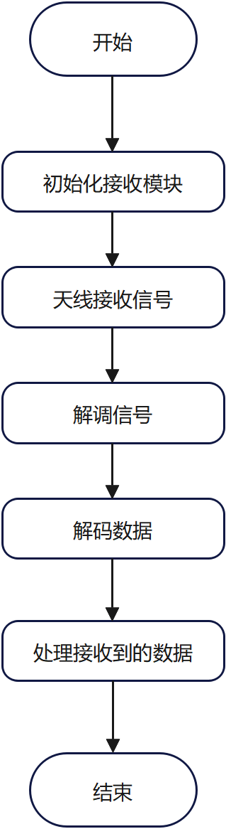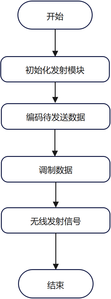 无线通信模块包含发射和接收功能。发射流程为:初始化发射模块,将待发送数据进行编码和调制,然后通过天线发射出去;接收流程为:初始化接收模块,通过天线接收信号,对信号进行解调和解码,最后处理接收到的数据。