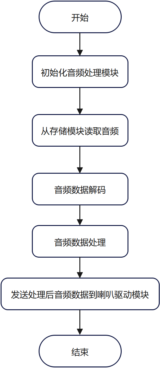 音频处理模块负责对音频信号进行解码、处理和播放[10]。其程序流程为:初始化音频处理模块,从存储模块读取音频数据,对数据进行解码和处理,最后将处理后的音频数据发送到喇叭驱动模块。