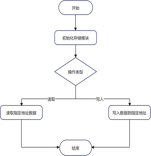 存储模块用于存储铃声、设置参数等信息。程序流程为:初始化存储模块,判断是读取还是写入操作,若为读取则从指定地址读取数据,若为写入则将数据写入指定地址。