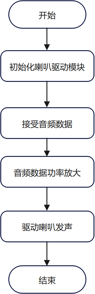 喇叭驱动模块将音频处理模块发送的音频数据放大并驱动喇叭发声。程序流程为:初始化喇叭驱动模块,接收音频数据,对数据进行功率放大,最后驱动喇叭发声。