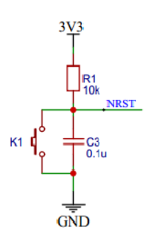 复位电路如图3.5所示。STM32103C8T6 的复位电路是确保芯片能正确启动与稳定运行的基础部分。该复位电路一般由一个电阻、一个电容以及一个按键组成。接通电源瞬间,电容开始充电,由于电容两端电压不能突变,此时微控制器的复位引脚为低电平,芯片处于复位状态。随着电容充电,其两端电压逐渐升高,当达到芯片复位引脚的高电平阈值时,芯片脱离复位状态,开始正常工作。若在运行中按下复位按键,电容会迅速放电,复位引脚再次变为低电平,芯片进入复位状态,程序重新开始执行。复位电路的存在意义重大,它能在系统上电、异常情况发生时,让芯片恢复到初始设定状态,清除内部寄存器的错误状态,确保各个功能模块有序启动,保障芯片稳定、可靠地运行,避免因意外干扰等因素导致程序跑飞或系统异常。