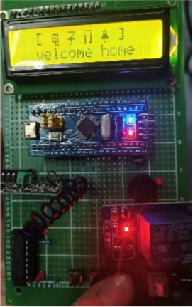 蜂鸣器、继电器控制测试结果如图5.6所示。对基于STM32的音乐电子门铃进行蜂鸣器和继电器功能测试。先给系统上电,操作按键触发指令。观察蜂鸣器,能够按设定规则发出声音;对于继电器,继电器模拟开关门动作,按下开门按键时,继电器模拟开门动作,多次测试动作准确。二者表现都正常,则此部分功能测试通过[12]。