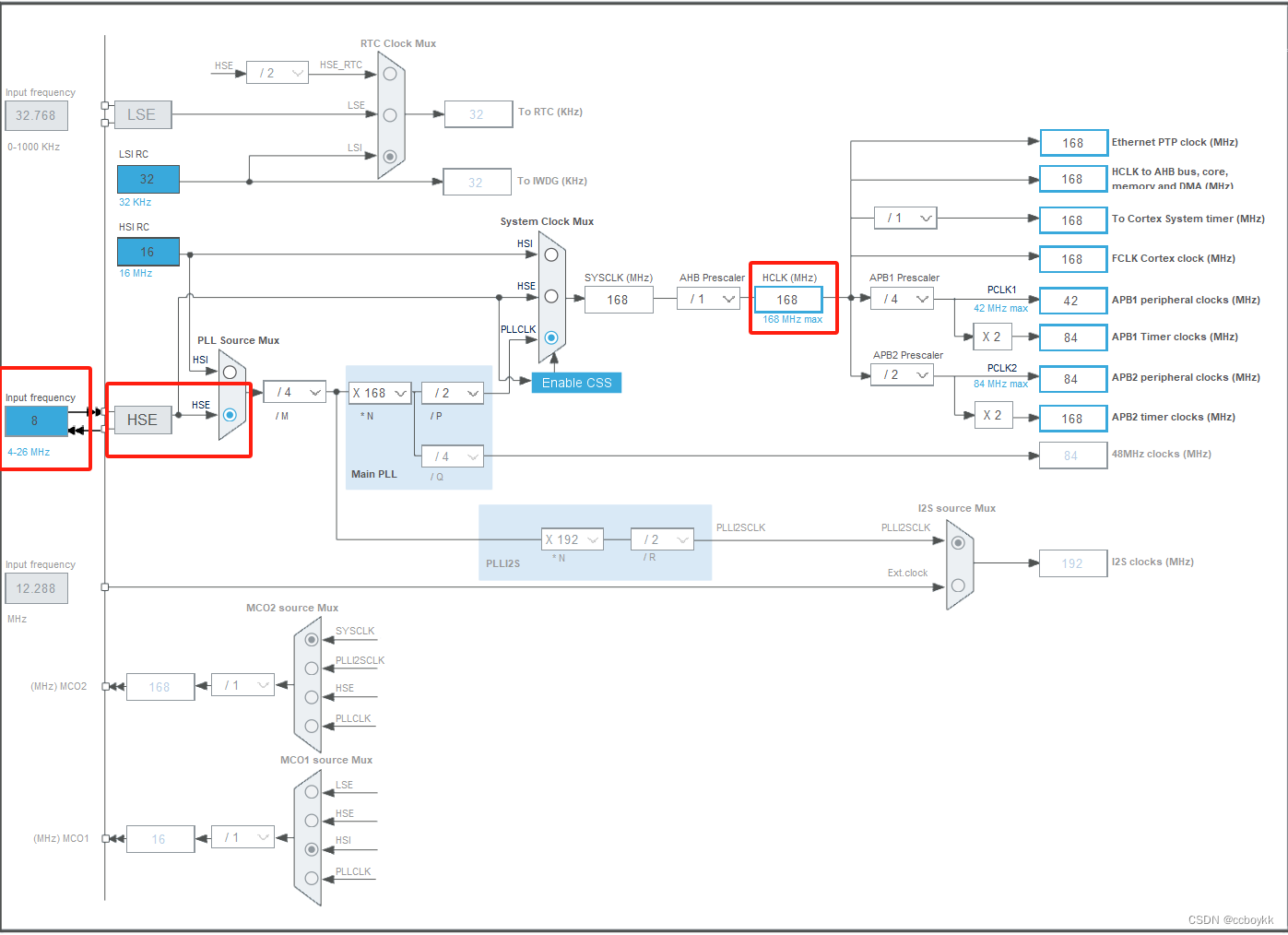 stm32f4_cubemx配置时钟rcc_HSE外部时钟 一旦选择了 HSI 或 HSE 作为系统时钟源,你可以通过配置分频因子来调整系统时钟频率以满足应用需求。此外,有些应用中还会使用 PLL(Phase-Locked Loop)来将 HSI 或 HSE 的频率倍增,以获得更高的系统时钟频率。因此,选择适当的时钟源和配置非常重要,以满足应用的性能和精度要求。如果你的应用需要更高的时钟精度和稳定性,通常会选择使用 HSE(外部晶振器或陶瓷谐振器)作为系统时钟源。你可以根据你的应用需求和性能要求来选择适合的时钟源。使用HSI也是可以的。正点原子的是8MHz。