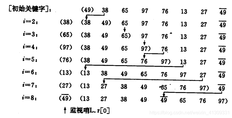 从头到尾依次扫描未排序序列,将扫描到的每个元素插入有序序列的适当位置。(如果待插入的元素与有序序列中的某个元素相等,则将待插入元素插入到相等元素的后面。)