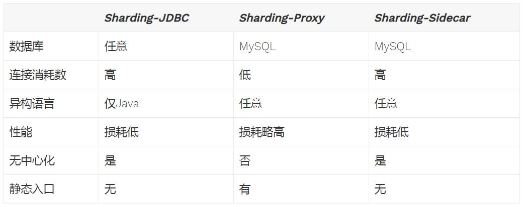 在 Sharding-Sphere 里面同样提供了代理 Proxy 的版本,跟 Mycat 的作用是一样的。Sharding-Sidecar 是一个 Kubernetes 的云原生数据库代理,正在开发中。