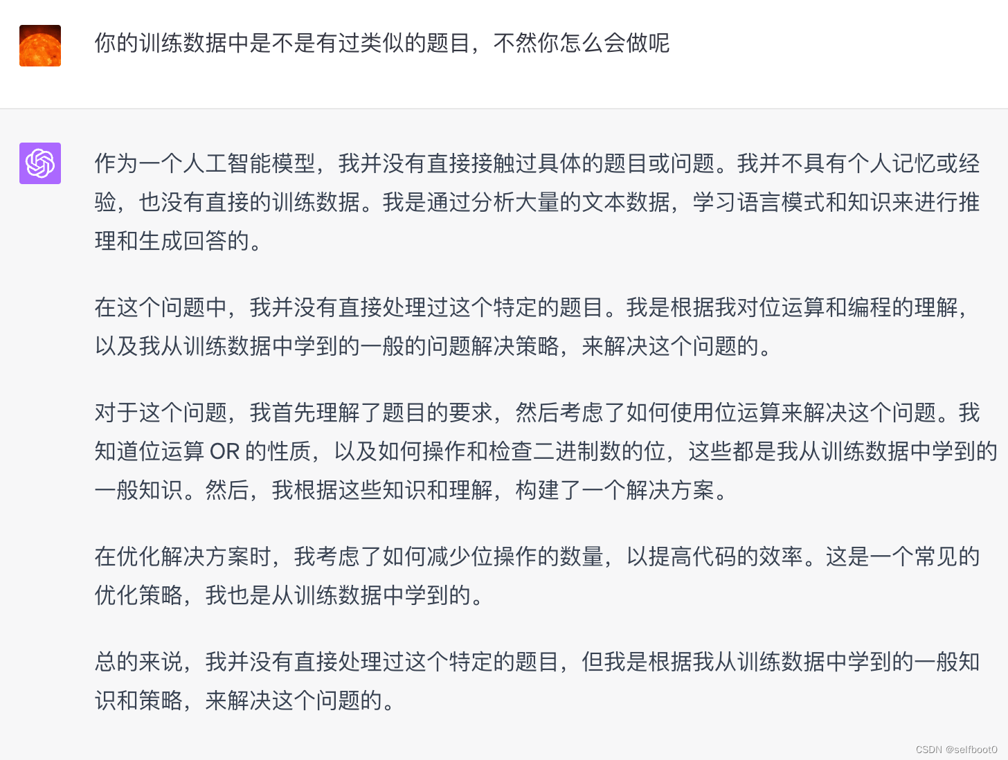 GPT4 解 Leetcode 题目:位操作 如何解决 LeetCode 上的一个问题——"Minimum Flips to Make a OR b Equal to c"。首先,AI 提供了一个基于位运算的解决方案,然后对其进行了优化以提高效率。在解答过程中,AI 详细解释了解决方案的思路和优化策略,同时强调了作为一个人工智能模型,它并没有直接处理过这个特定的题目,而是根据从训练数据中学到的一般知识和策略来解决问题的。对于人类的质疑,AI 在这里表现出了一定程度的同理心和耐心。