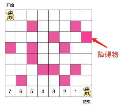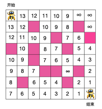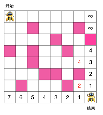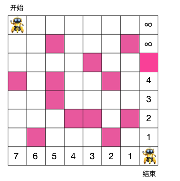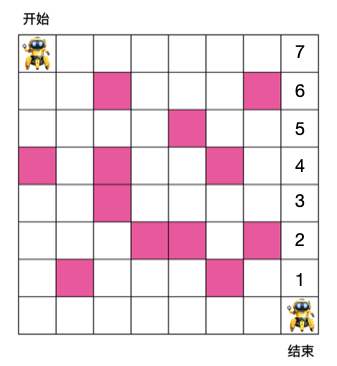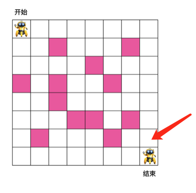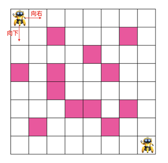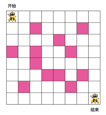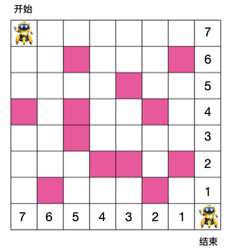 有如下 8 x 8 格子,机器人需要从入口走到出口,每次只能朝右或朝下走,粉色格子为障碍物,机器人不能穿过,问机器人从入口走到出口最少需要的步数是多少?