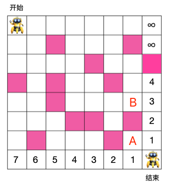 对于 B 来说,它右格子到出口的最小步数为 3,其下格子是障碍物,到出口的步数为无穷大,所以 B 到出口的最小步数为 1 + min(∞, 3) = 4。如下