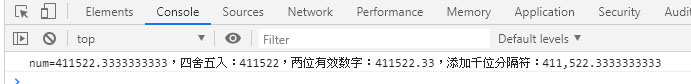 console.log("num=" + num + ",四舍五入:" + Math.round(num) + ",两位有效数字:" + num.toFixed(2) + ",添加千位分隔符:" + formatNumber(num));