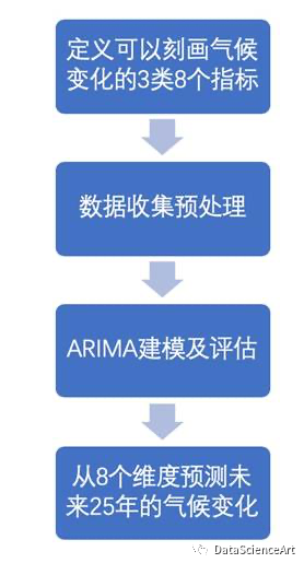这部分我们要解决的问题是建立一个刻画气候变化的模型对未来 25 年的气候变化进行预测。首先我们先要定义可以刻画气候变化的指标,通过查找相关资料,我们选取了3大类8个指标来刻画气候变化,并通过ARIMA进行未来25年的时间序列预测。问题二的解题思路如下所示: