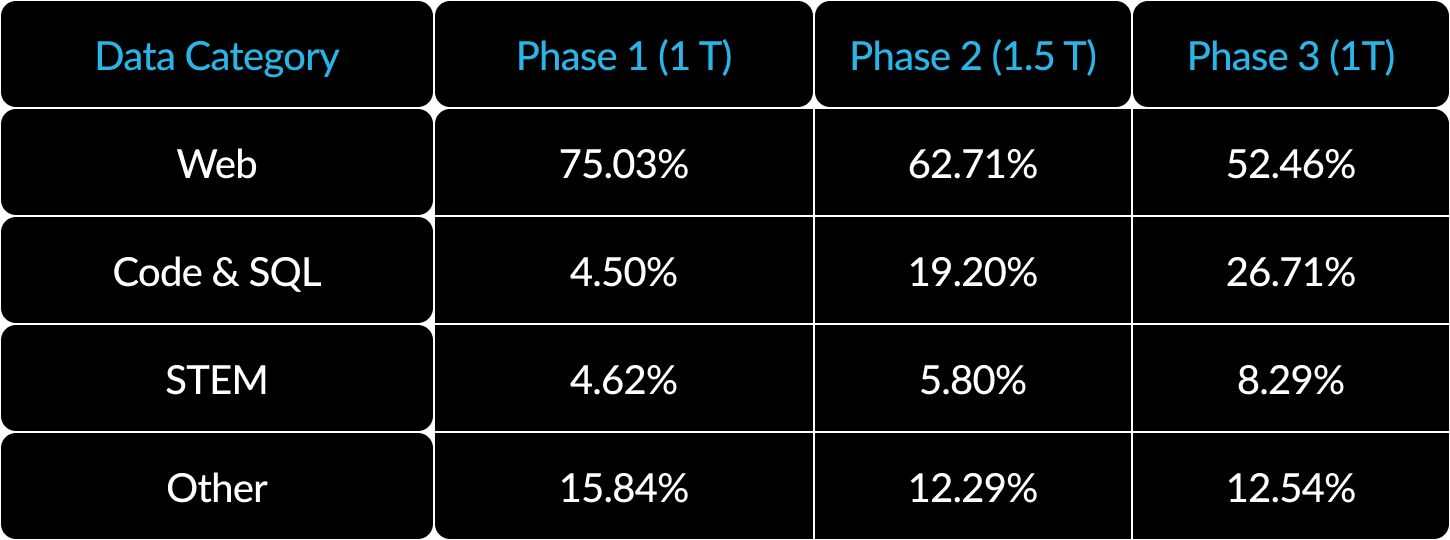 3)以企业为中心的数据课程:在代码生成和SQL等企业指标方面表现出色,需要的数据课程与通用指标的训练模型截然不同。在数百次小规模消融中,我们了解到,在开始时可以学习常识推理等通用技能,而编码、数学和 SQL 等更复杂的指标可以在培训的后期有效学习。人们可以类比人类的生活和教育,在人类生活和教育中,我们获得了从简单到困难的能力。因此,Arctic 接受了三阶段课程的培训,每个阶段都有不同的数据构成,第一阶段侧重于通用技能(1T tokens),后两个阶段侧重于以企业为中心的技能(1.5T 和 1T tokens)。这里显示了我们动态课程的高级摘要。