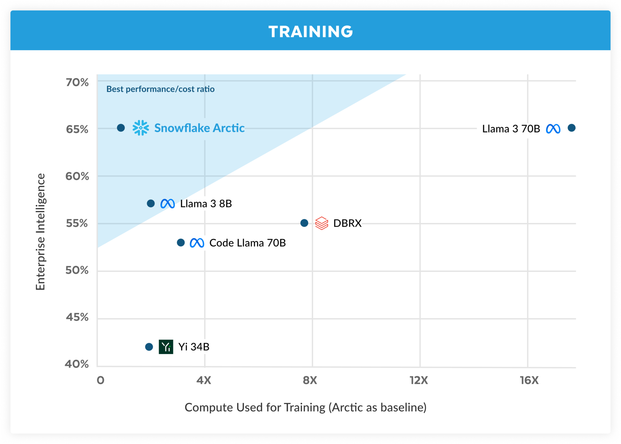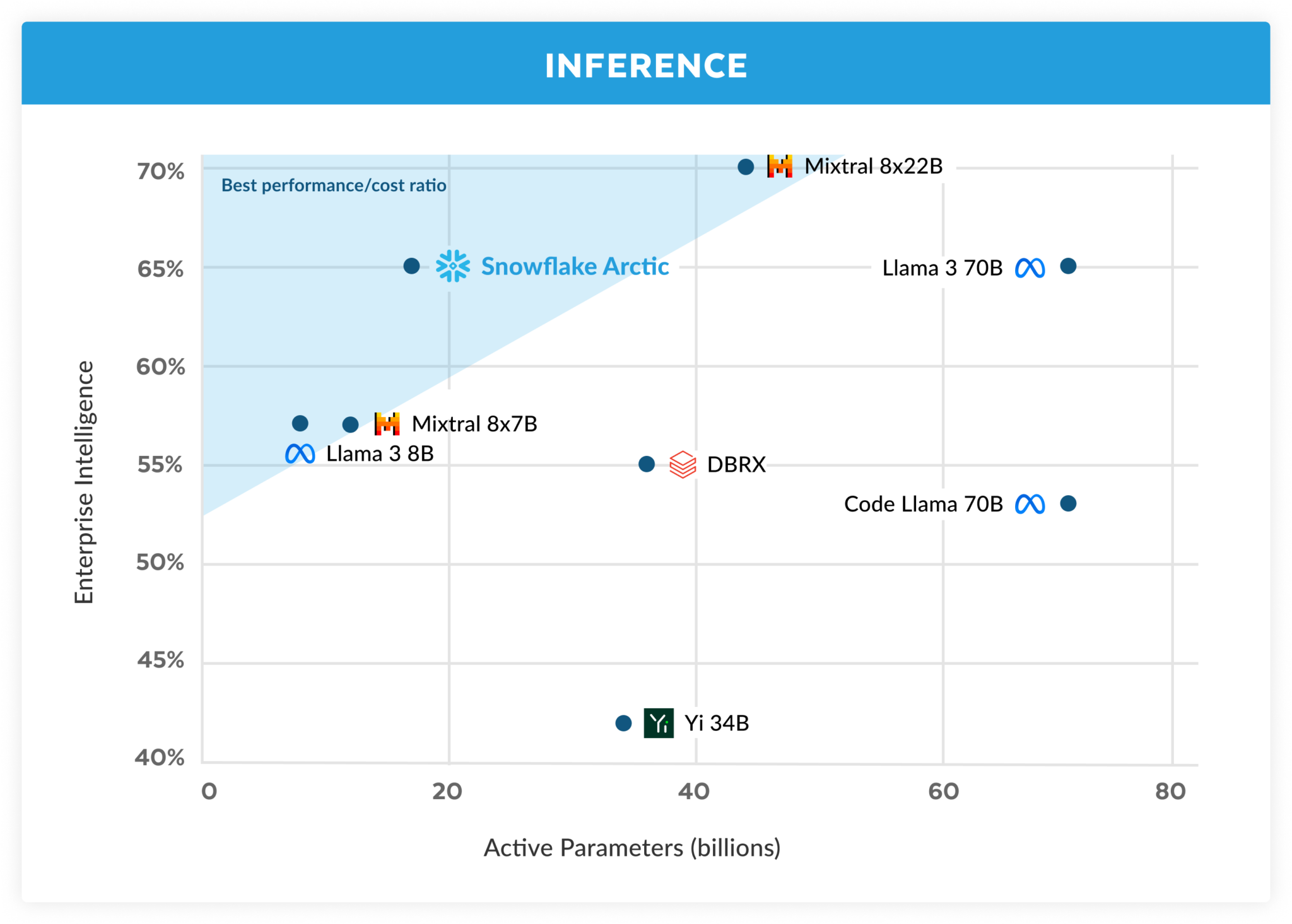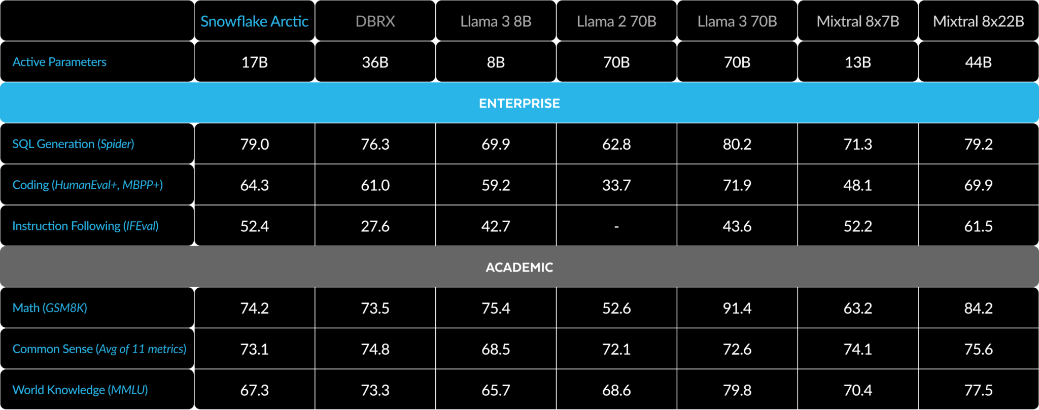 在 Snowflake,我们看到企业客户的 AI 需求和用例模式一致。企业希望使用 LLM 来构建对话式 SQL 数据副驾驶、代码副驾驶和 RAG 聊天机器人。从指标的角度来看,这意味着 LLM 在 SQL、代码、复杂的指令跟踪和生成扎实的答案的能力方面表现出色。我们通过对编码(HumanEval+ 和 MBPP+)、SQL 生成 (Spider) 和指令跟踪 (IFEval) 进行平均,将这些能力捕获到我们称之为企业智能的单一指标中。