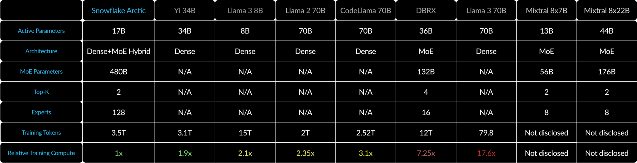 说回正题,自Grok-1发布后,开源界反响巨大——DBRX 和 C4AI Command R+ 相继发布,并宣布开源,希望填补企业空白。同时Datasets也增加了些许新的项目。就在24号,一向玩企业云计算和数据库的Snowflake,突然发布了一款仅为482B的开源企业级LLM——Snowflake Arctic。这是一款以企业为中心的顶级 LLM,它推动了具有成本效益的培训和开放性的前沿。Arctic是高效智能和真正开放的。