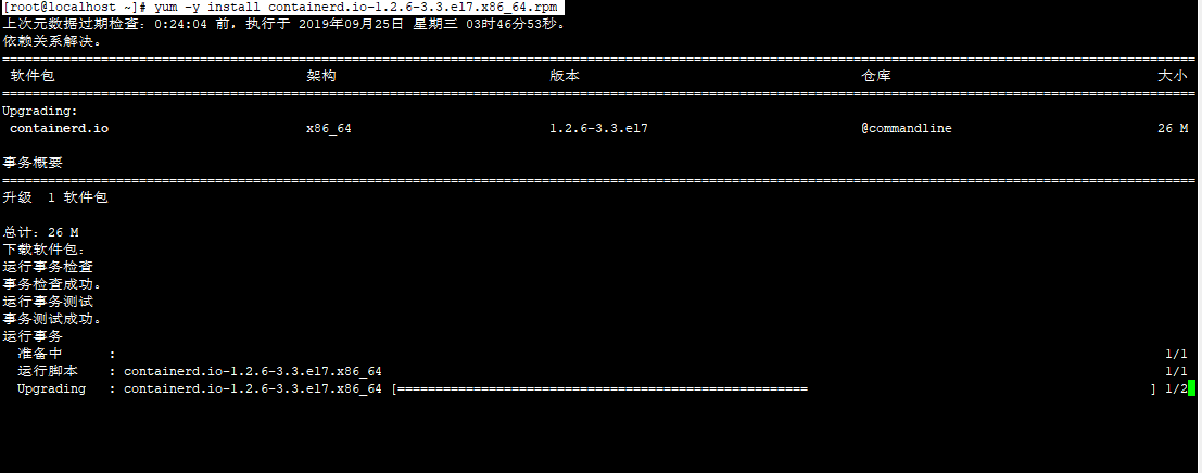 [root@localhost ~]# yum -y install containerd.io-1.2.6-3.3.el7.x86_64.rpm //升级containerd.io软件包