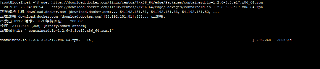 [root@localhost ~]#wget https://download.docker.com/linux/centos/7/x86_64/edge/Packages/containerd.io-1.2.6-3.3.el7.x86_64.rpm //下载相关软件包