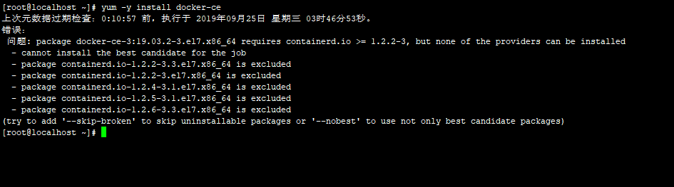 结果: 检查发现containerd.io此软件包已经安装,但版本是1.2.0;所以造成这种安装失败的原因是containerd.io软件包版本过低