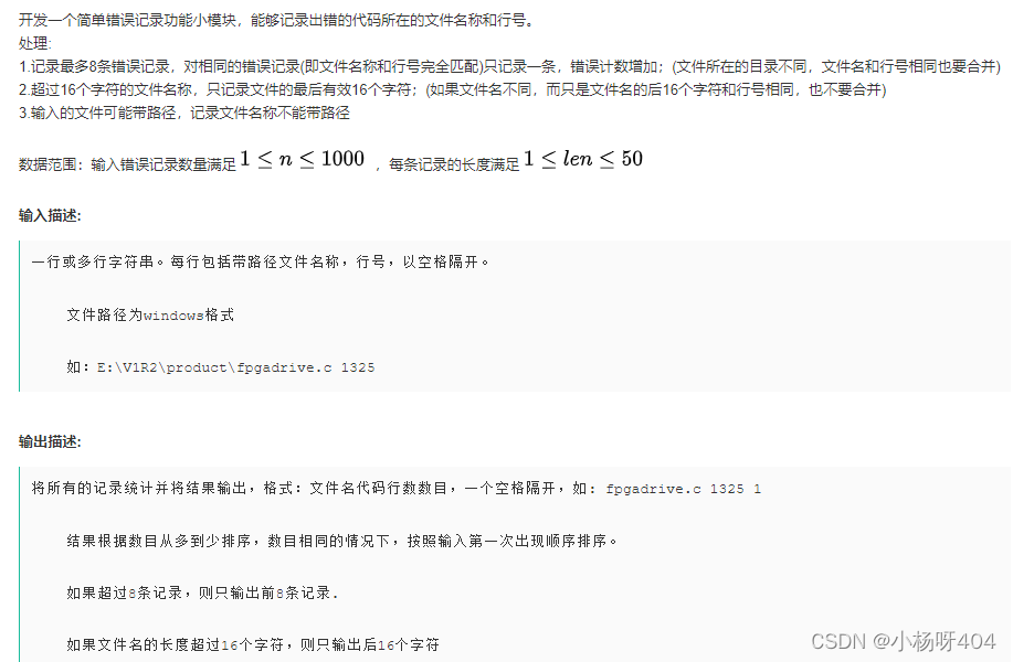 题目:思路:首先用异常处理读取全部输入,然后找到每个元素的最后一个\的位置,将\后面的存储,判断存储的元素是否在列表中已有,如果有,在数量是哪个加一,不添加到列表,否则添加到列表。最后根据数量从大到小排序,并将文件名大于16的取最后16个字符,注意一定要最后再取,不然会出现有些不是同一个文件,但是后16个字符与其它的相等,就会增加数量而不是添加到列表。代码:import syss = []r = []while True: try: line = s.