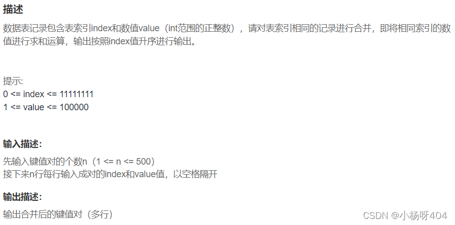 一、合并表记录题目:思路:双重循环遍历对比,这里我事先排了序,这样不相等时立即跳出,可节约一点点时间,我在增加之后,将后一项值改为0,因为题目说值是大于0的。比较完之后,将值为0的项删除即可代码:import copyn = int(input())m = []for i in range(n): m.append(list(map(int,input().split())))m.sort()for i in range(n-1): for j i..
