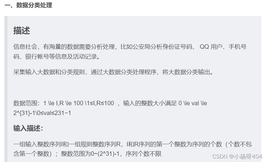 一、数据分类处理描述信息社会,有海量的数据需要分析处理,比如公安局分析身份证号码、QQ用户、手机号码、银行帐号等信息及活动记录。采集输入大数据和分类规则,通过大数据分类处理程序,将大数据分类输出。数据范围:1 \le I,R \le 100 \1≤I,R≤100,输入的整数大小满足0 \le val \le 2^{31}-1\0≤val≤231−1输入描述:一组输入整数序列I和一组规则整数序列R,I和R序列的第一个整数为序列的个数(个数不包含第一个整数);整数范围...