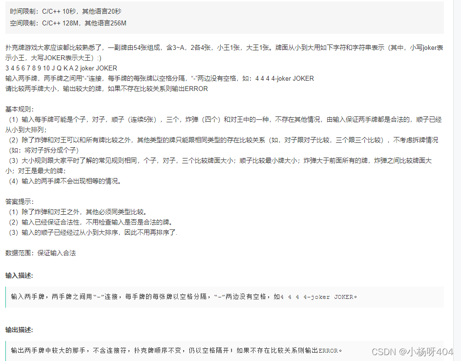 题目:思路:分情况讨论,只要不要漏掉,就没什么问题。第一种情况某一个是对王,输出;第二种情况长度不相等且都不是炸弹,输出error;第三种长度相等,因为是排好序的,直接比较最后一张牌的大小,输出大的那个,这里我用了一个列表;第四种情况某一个为4个的炸弹,输出那个就好了代码:a,b = map(str,input().split('-'))card1 = a.split(' ')card2 = b.split(' ')if card1 == ['joker', 'JOKER'.