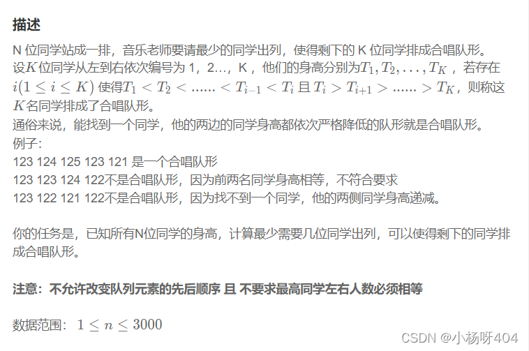 描述N 位同学站成一排,音乐老师要请最少的同学出列,使得剩下的 K 位同学排成合唱队形。设KK位同学从左到右依次编号为 1,2…,K ,他们的身高分别为T_1,T_2,…,T_KT1​,T2​,…,TK​,若存在i(1\leq i\leq K)i(1≤i≤K)使得T_1<T_2<......<T_{i-1}<T_iT1​<T2​<......<Ti−1​<Ti​且T_i>T_{i+1}>......>T_KTi​>Ti...