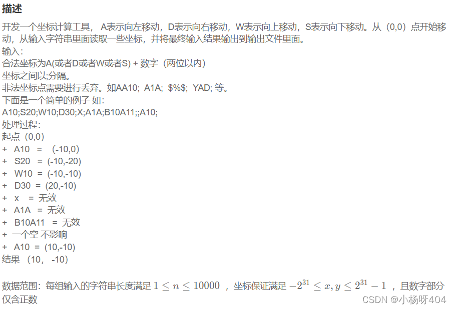 一、坐标移动思路:分情况讨论,先剔除无效情况,再移动,注意输出一定要先拼成字符串再输出,不然会多空格,格式不对。代码:b = str(input())s = b.split(';')ss = []for i in range(len(s)): if (len(s[i]) == 3) and (s[i][0] in 'ADWS'): if (s[i][1] in '0123456789') and (s[i][2] in '0123456789'):
