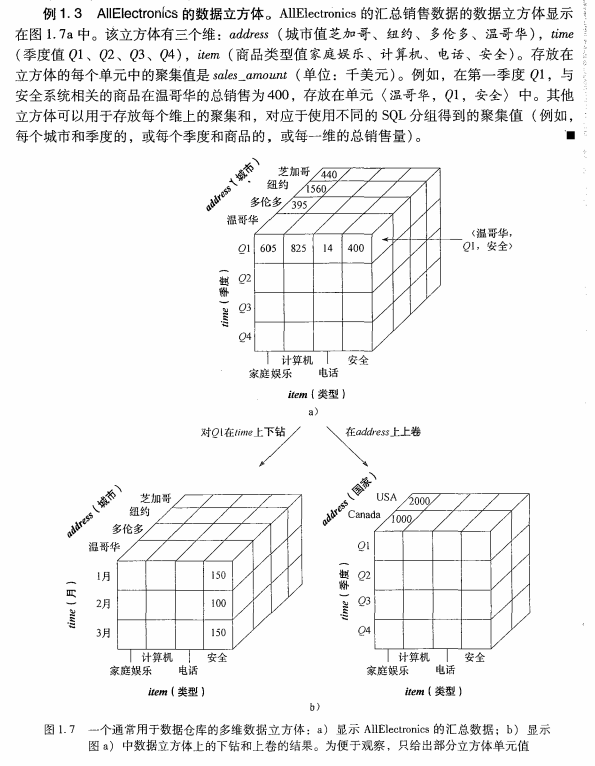数据仓库存储从历史的角度提供信息,并且通常是汇总的。数据仓库用称作数据立方体(data cube)的多维数据结构建模。其中,每个维对应于模式中的一个或一组属性,而每个单元存放某种聚集度量值,如count或sum。数据立方体提供数据的多维视图,并允许预计算和快速访问汇总数据。