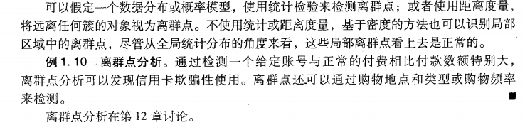 数据集中可能包含一些数据对象,它们与数据的一般行为或模型不一致。这些数据对象是离群点。大部分数据挖掘方法都将离群点视为噪声或异常而丢弃。然而,在一些应用中(例如,欺诈检测),罕见的事件可能比正常出现的事件更令人感兴趣。离群点数据分析称作离群点分析或异常挖掘。