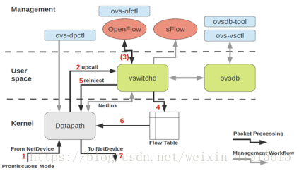ovs kernel module: OVS的内核模块,处理包交换和隧道,缓存flow,如果在内核的缓存中找到转发规则则转发,否则发向用户空间去处理。