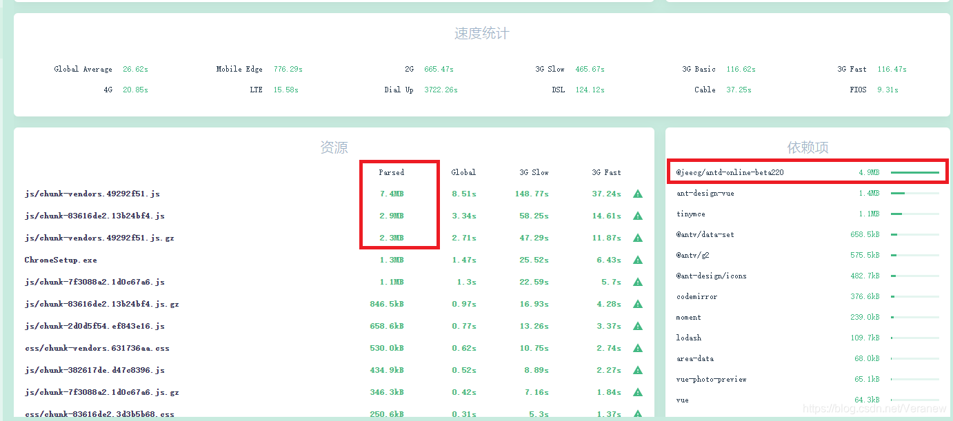 2.打开report.html文件,包含文件分析图。色块的大小代表js文件的大小,最大的两个js文件,里面都是一些第三方依赖包,将一些比较大的依赖包提取出来就可以减少chunk-vendors的大小。