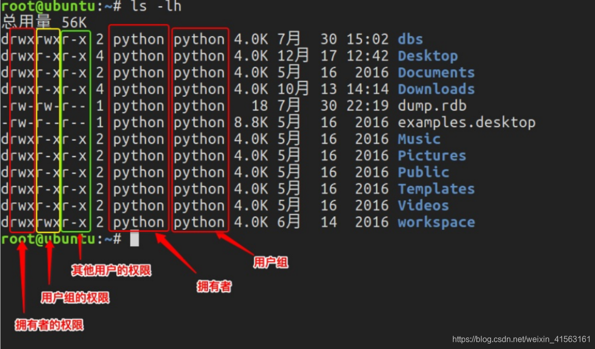 第1个字⺟代表⽂件的类型:“d” 代表⽂件夹、“-” 代表普通⽂件、“c” 代表硬件字符设备、“b” 代表硬件块设备、“s”表示管道⽂件、“l” 代表软链接⽂件。 后 9 个字⺟分别代表三组权限:⽂件所有者、⽤户者、其他⽤户拥有的权限。