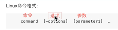 command: 命令名,相应功能的英⽂单词或单词的缩写 [-options]:选项,可⽤来对命令进⾏控制,也可以省略, []代表可选 parameter1 …:传给命令的参数:可以是零个⼀个或多个