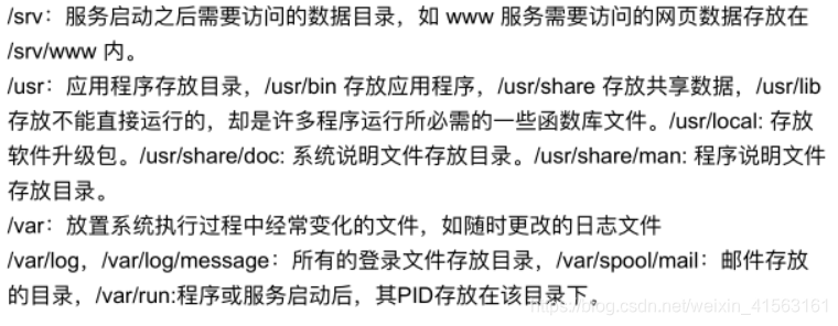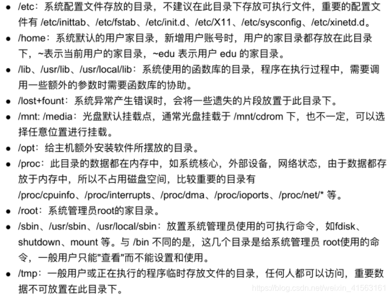 /bin、/usr/bin: 可执⾏⼆进制⽂件的⽬录,如常⽤的命令ls、tar、mv、cat等。