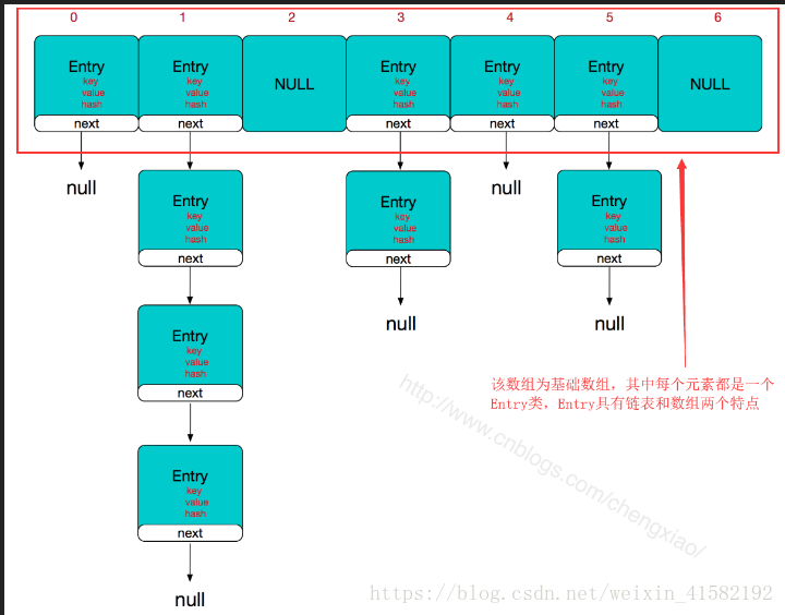 有图可知,HashMap是由数组+链表结构组成,数组是HashMap主体,链表则是为了解决哈希冲突而存在,如果对于Entry不含链表的位置,对其操作的时间复杂度为O(1),如果定位到具有链表的位置,则时间复杂度为O(n)。
