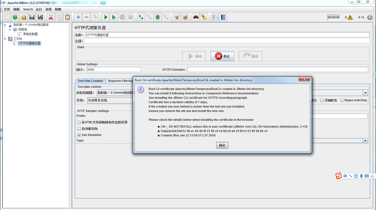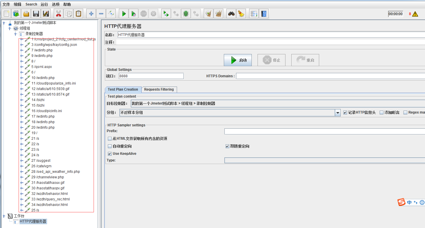 OK,设置完成便可以进行录制了,正常操作访问网站即可,看看Jmeter的状态。。