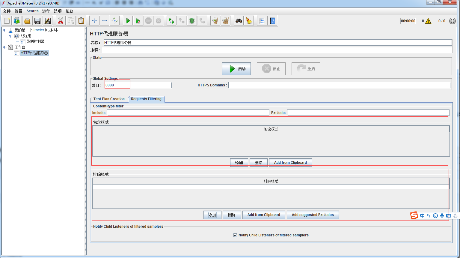 工作台中建立HTTP代理服务器,此处的代理服务器端口号(默认8888),以及目标控制器、分组、排除(正则筛选)、包含模式都是可以更改,当然也可以默认