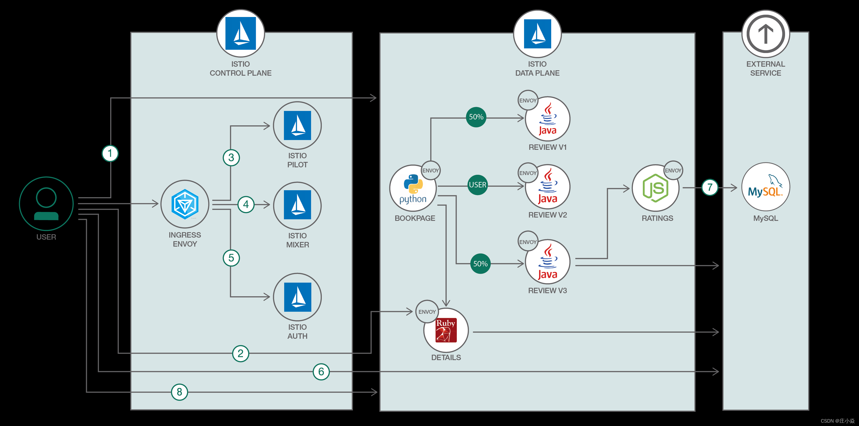 微服务尤其是 Google Istio 的推出对服务网格化的需求,给容器云平台注入了新的实际的微服务场景,可以预见是未来容器云平台应用的一个重要场景。如下图所示。