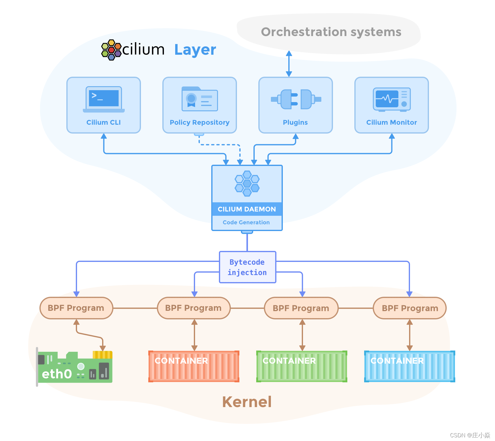 对于网络安全的需求,一种是策略性的网络速度的限制,还有一种是策略上的租户网络隔离,类似 VPC。这块比较有想法的参考开源项目是 cilium,如图: