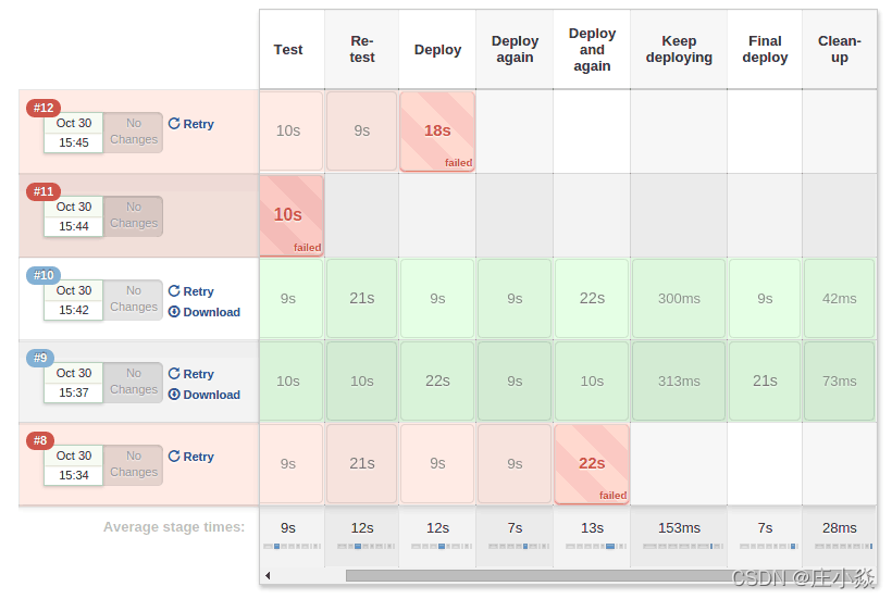 Jenkins 的管道部署把部署的流程形象化成为一个长长的管道,每间隔一小段会有一个节点,也就是 Job,完成这个 Job 工作后才可以进入下一个环节。形式如下: